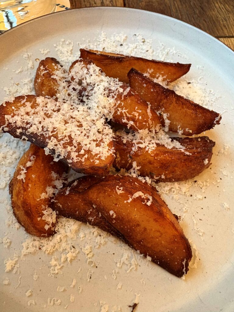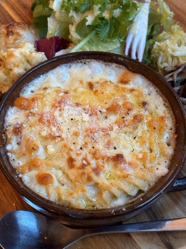 まずはカリカリ香ばしい「フライドポテト」を味わいながら、妻は「シーフードと里芋のグラタン」。熱々、すごくクリーミーでとろける里芋と濃厚なシーフードの旨み。