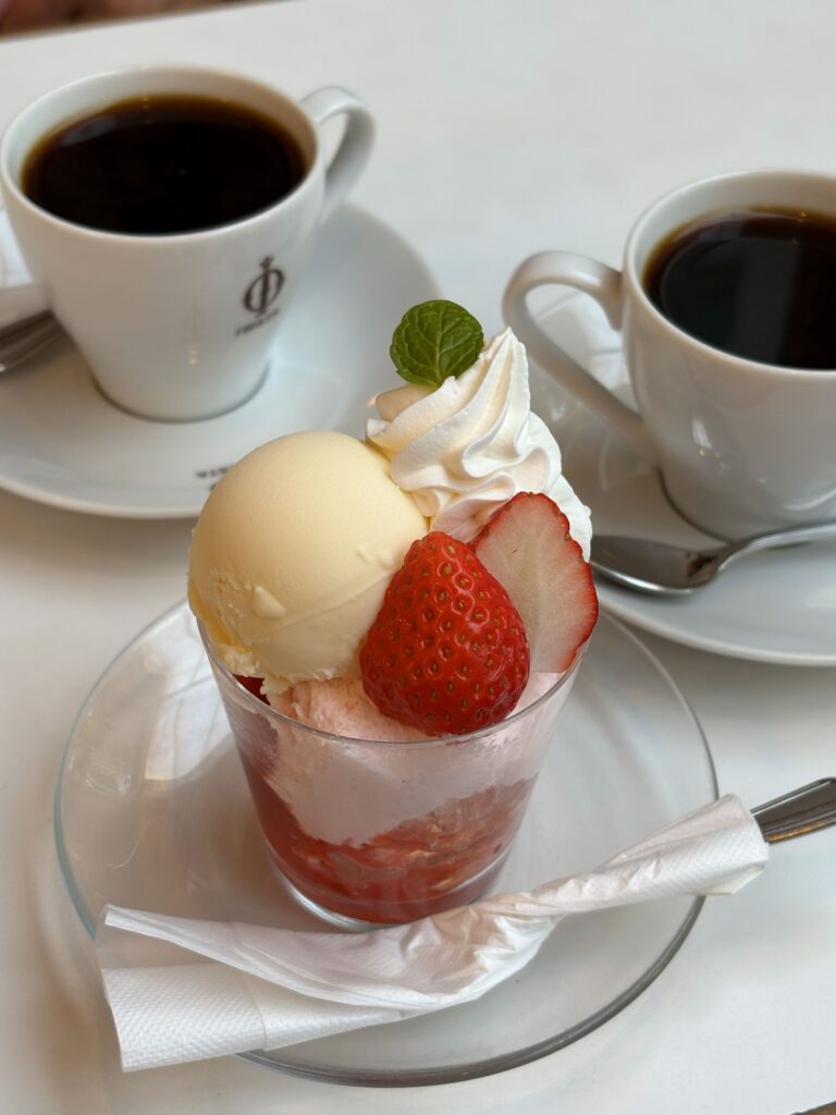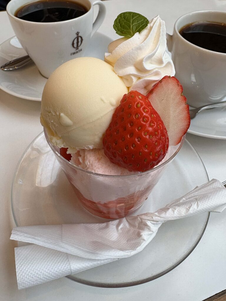 かわいいいちごがちょこんと乗って、たっぷりのアイスもうまい。