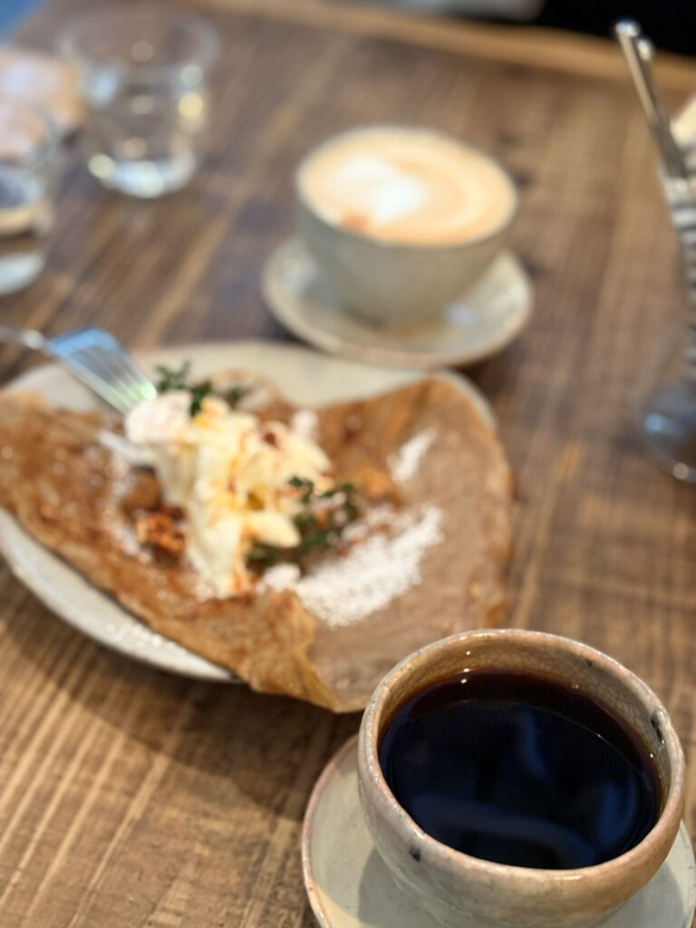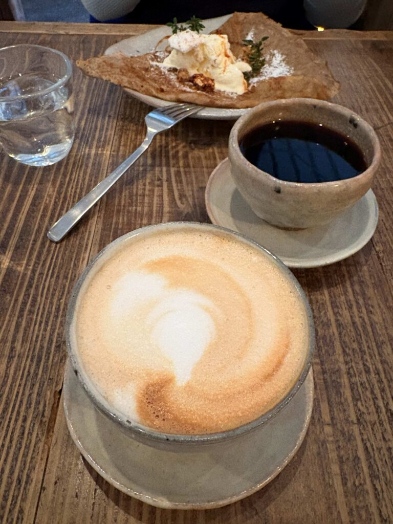 僕は妻のガレットを横取りしながら、ほっとするおいしさの「カフェラテ」でひと息つきました。