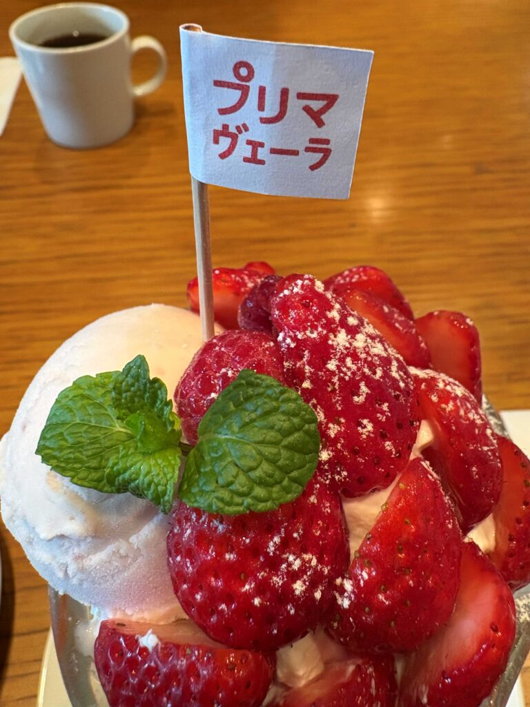 何気なく「パフェ プリマヴェーラ」を頼みましたが、あら、なんだか既視感、そうだ先週も食べてた〜(笑)。