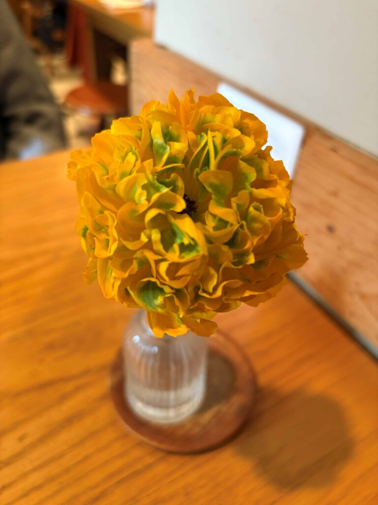 テーブルの上の黄色いお花。今日も癒されます。