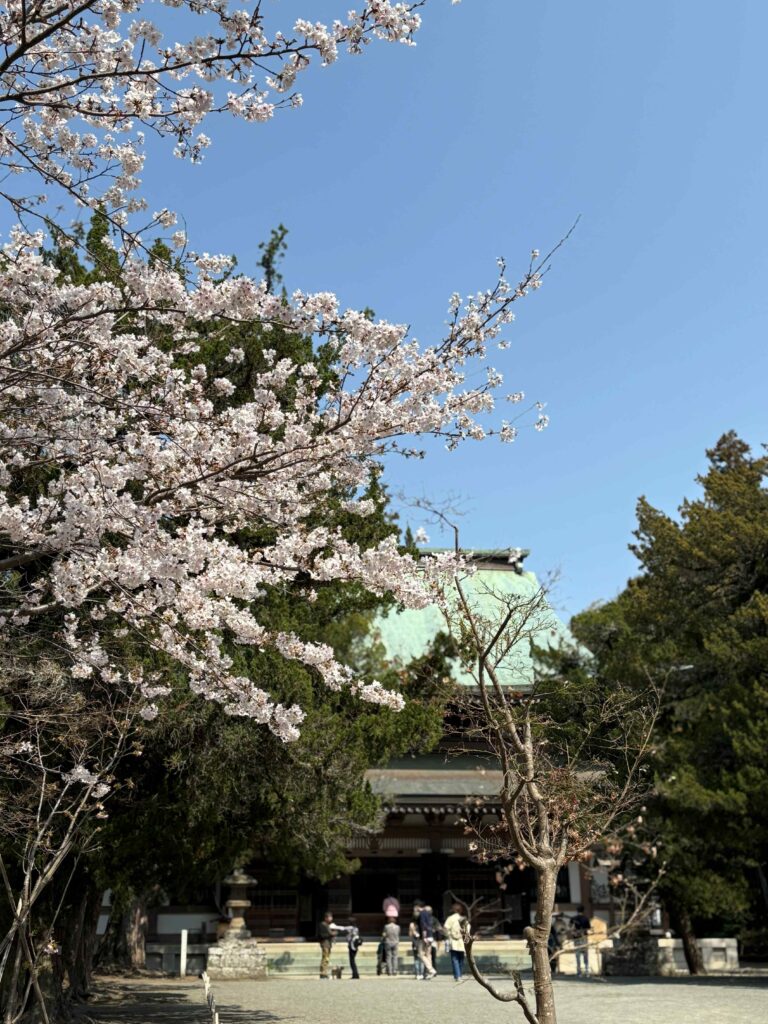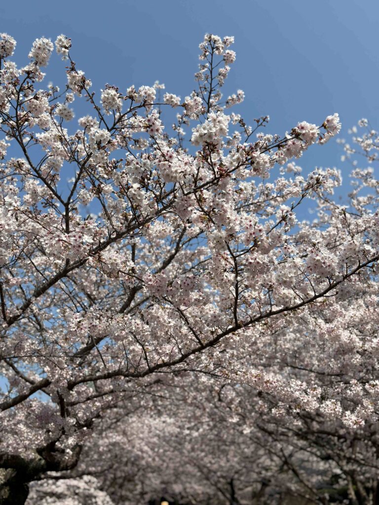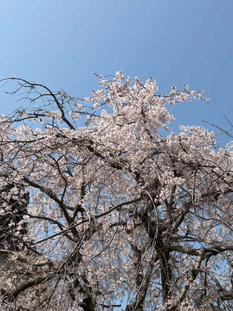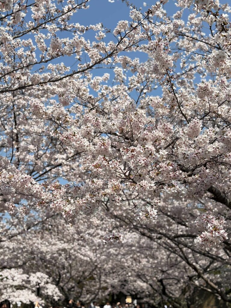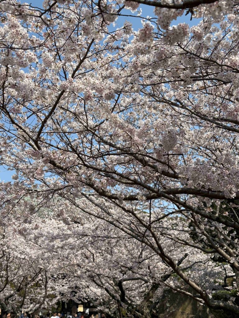参拝の皆さんが写り込まないようになるべく上に向けて写真を撮っていますが、実はこの桜の下にはびっしりとすごい人なのです。皆さん、思い思いに写真を撮って、とっても楽しそうです。