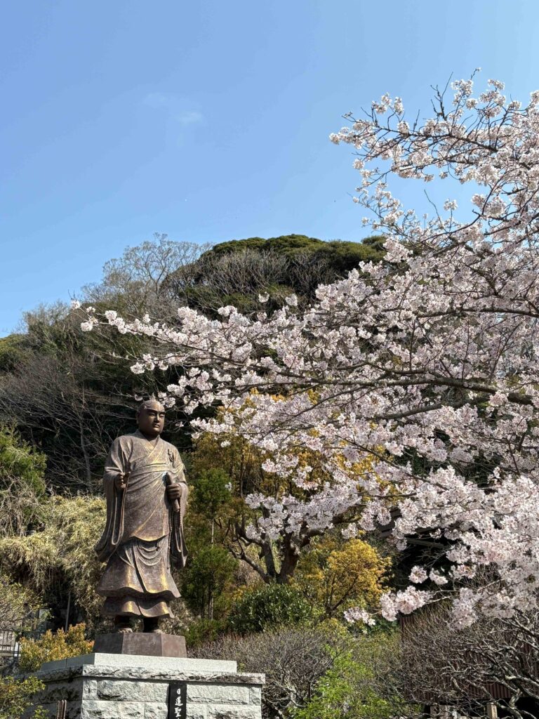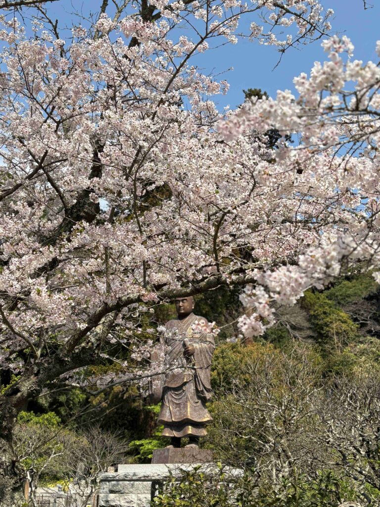 二天門をくぐった左、立派な日蓮上人像を包むように立派な桜が広がります。