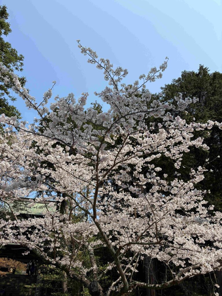 太陽の光がキラキラと輝く木漏れ日を抜け、境内が近づくと見えて来る桜です。