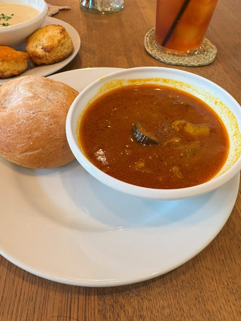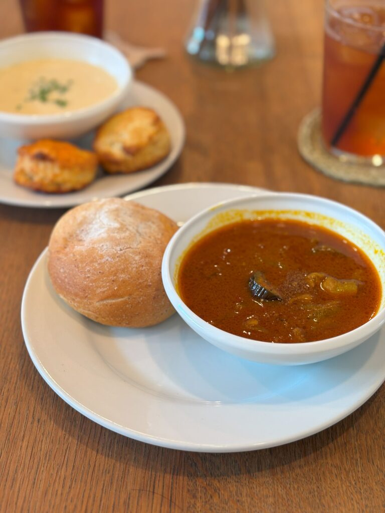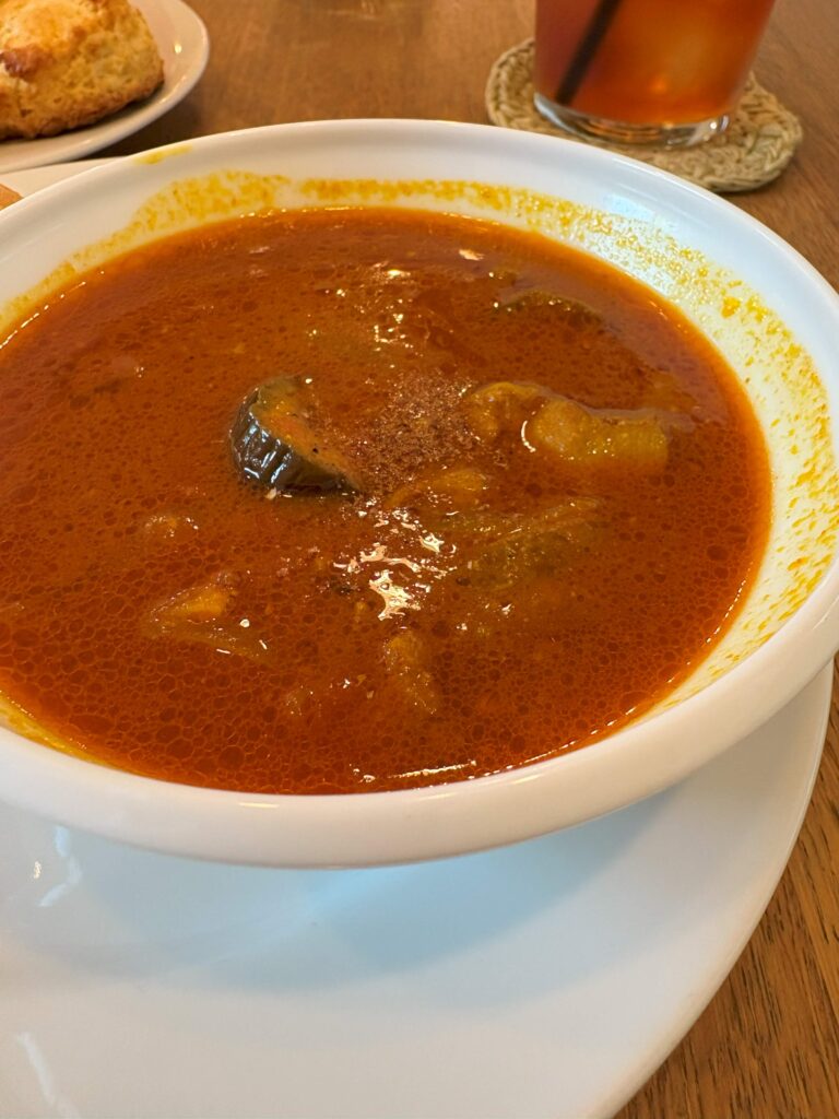 ピリッと辛いけど味わい深い「茄子とトマトのチキンカレースープ」、夏野菜がたくさん入って、スパイス香るカレースープがとてもおいしいですね。