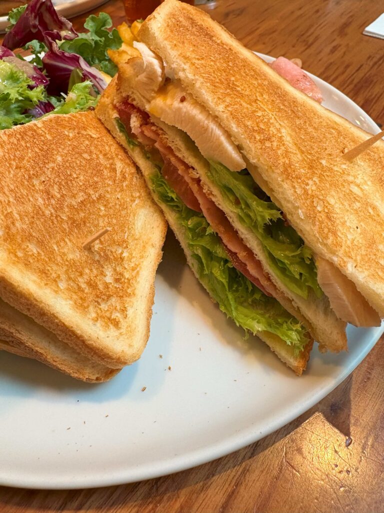 さくさくで味わい深いトーストにたっぷりのお野菜、やわらかくてジューシーなチキンがたっぷり、サンドされています。