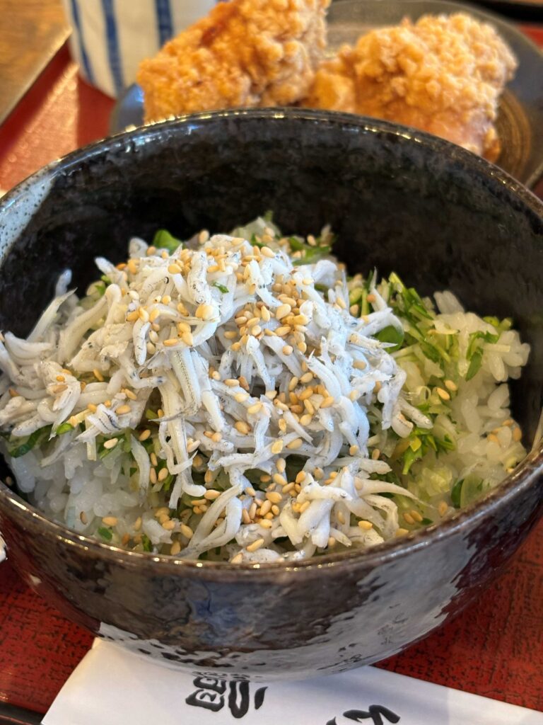 たくさん歩いて腹ペコの妻は竹扇さんの一押し、名物「釜揚げしらす丼セット」です。