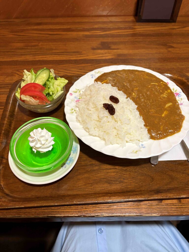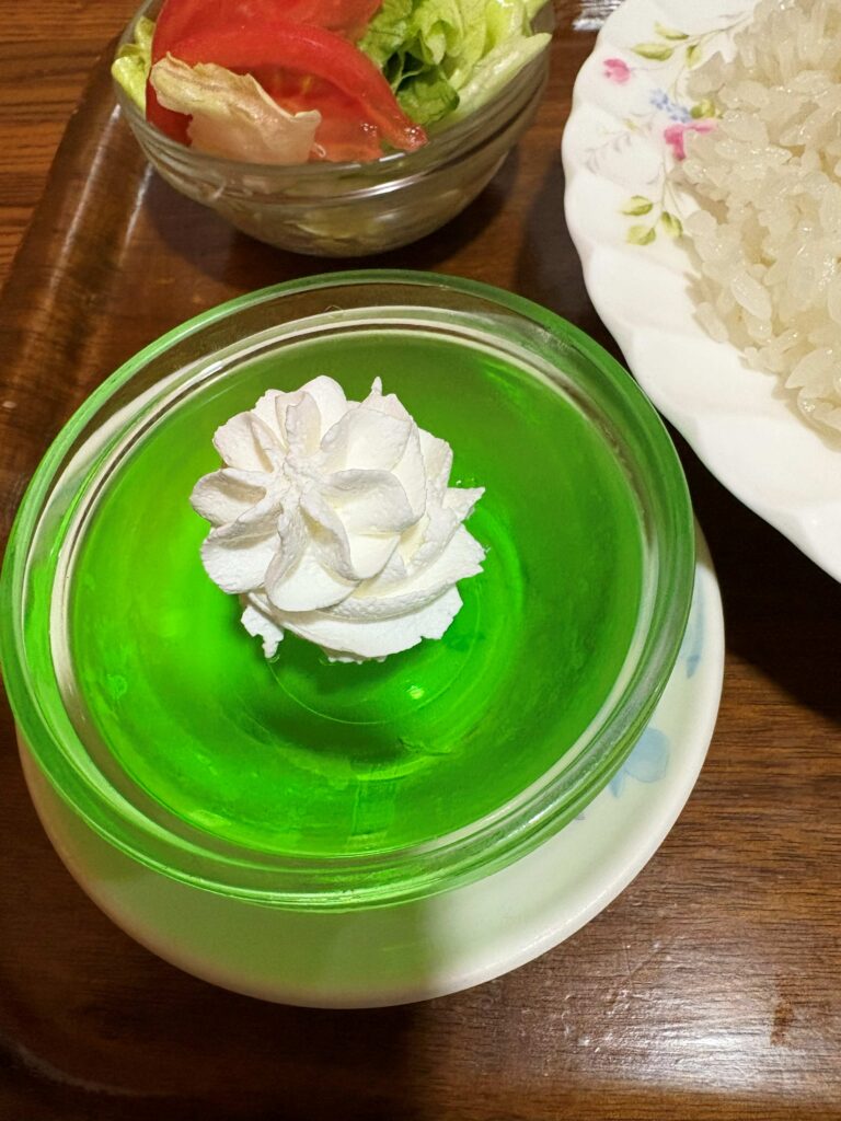 ミニサラダ」もドレッシングがおいしくて大好きです。お子様カレーに付いてくる「ゼリー」、今日はライム。色もきれいで、甘酸っぱい幸せなデザートです。