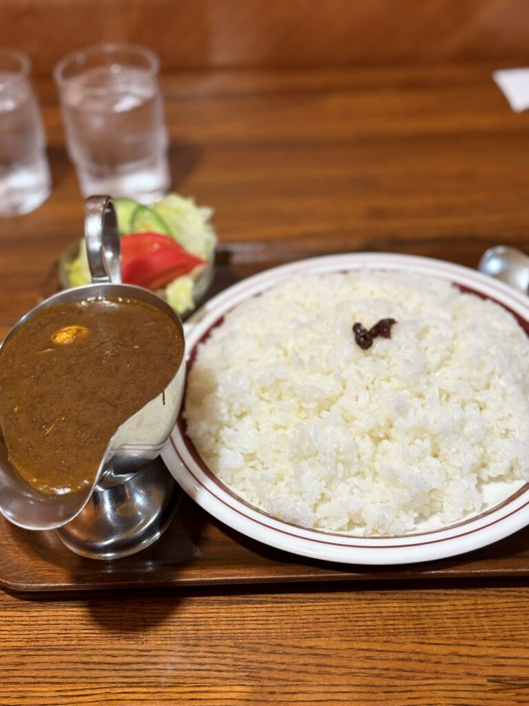普通盛りでもちょっと小山の様なご飯、そこにとろけるルーをたっぷりかけます。