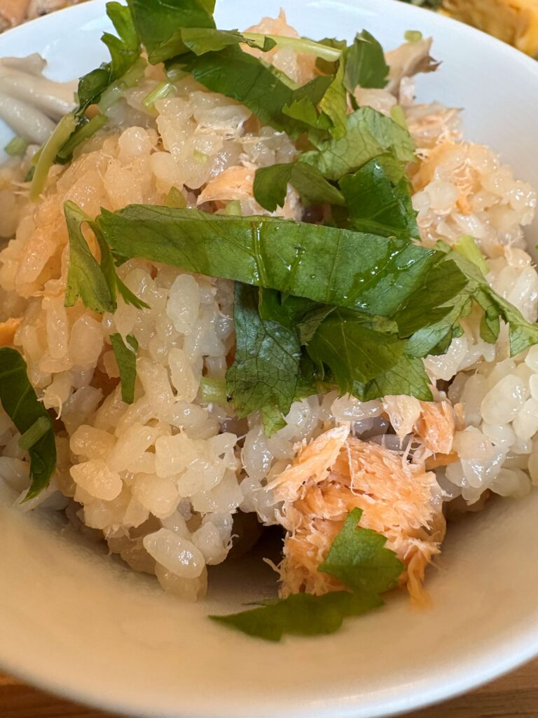 湯気がふわっと立ち昇る「舞茸と鮭のご飯」はほっかほか、たっぷりの具沢山。
