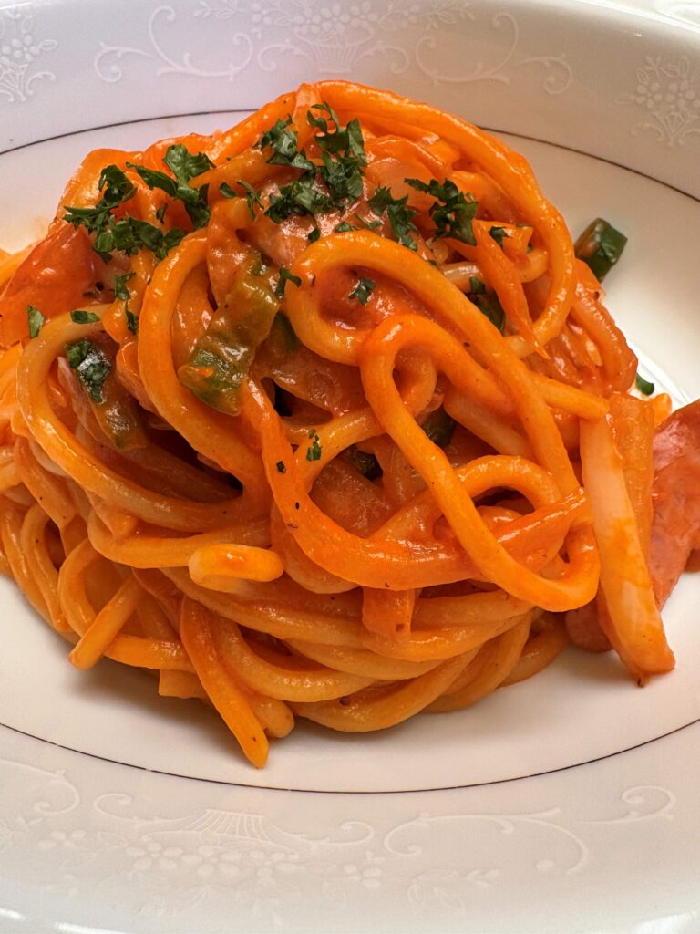 太めのもちもち麺に濃厚なトマトソースが絡んで、玉ねぎ、ピーマン、ソーセージがまた良い感じ。