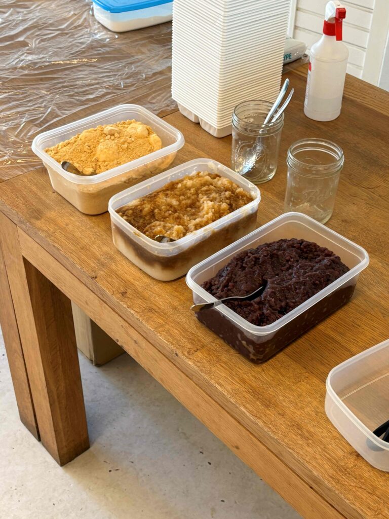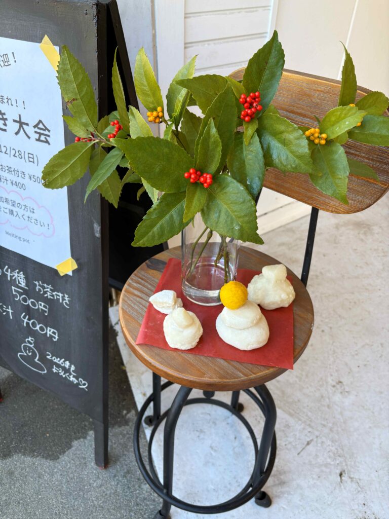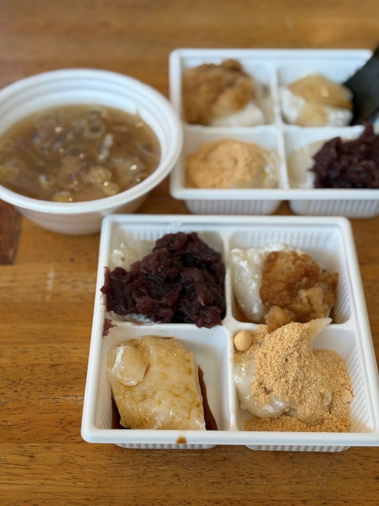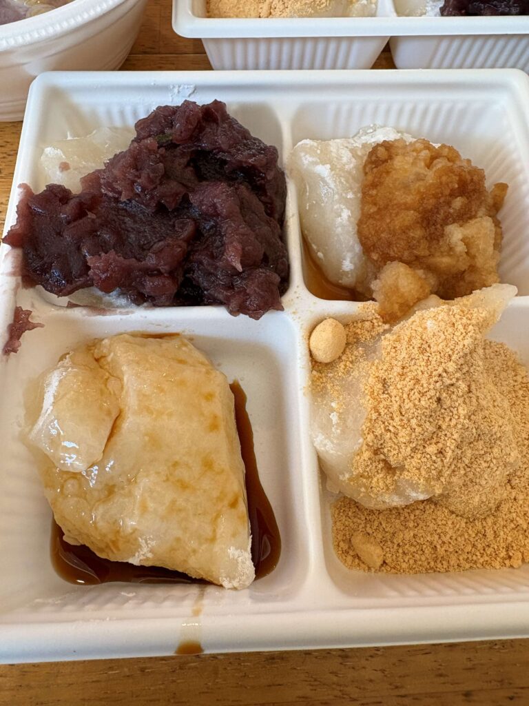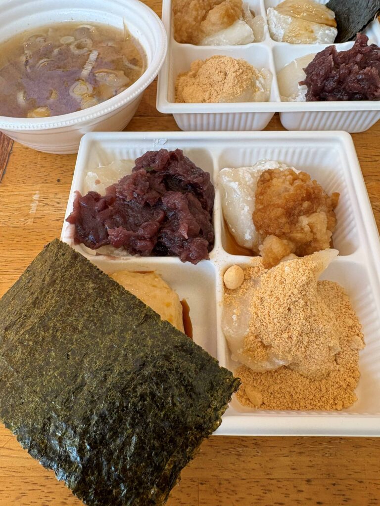 着々と準備が整う店内、自由に乗っけられるお餅のお供は「きな粉」「大根おろし」「あんこ」、そして「海苔とお醤油」です。