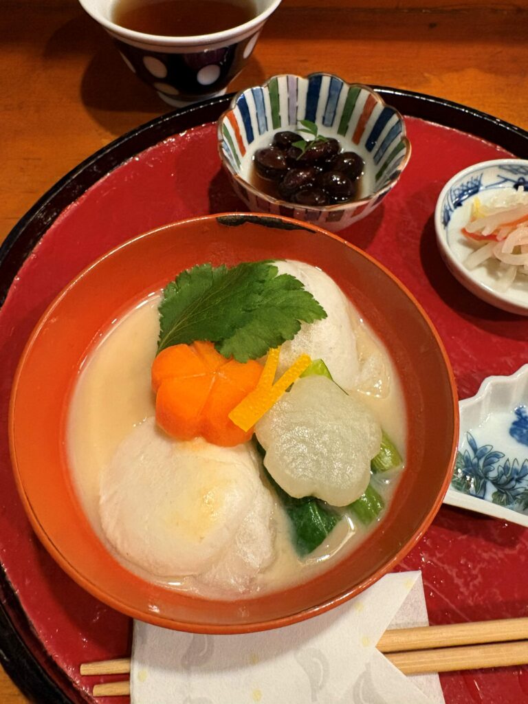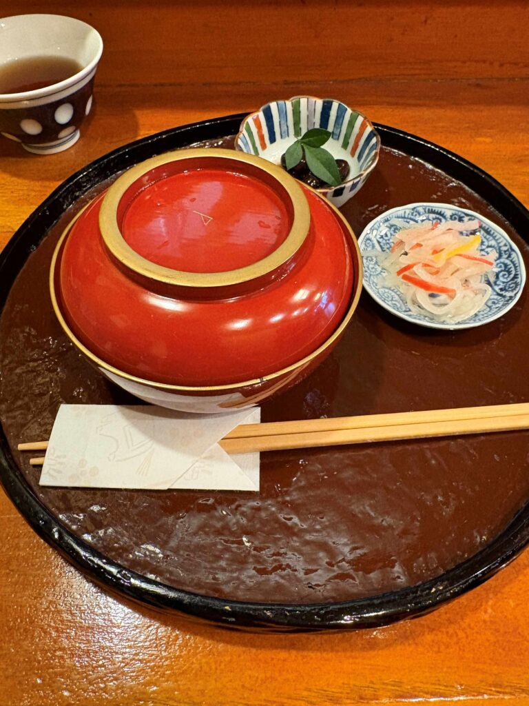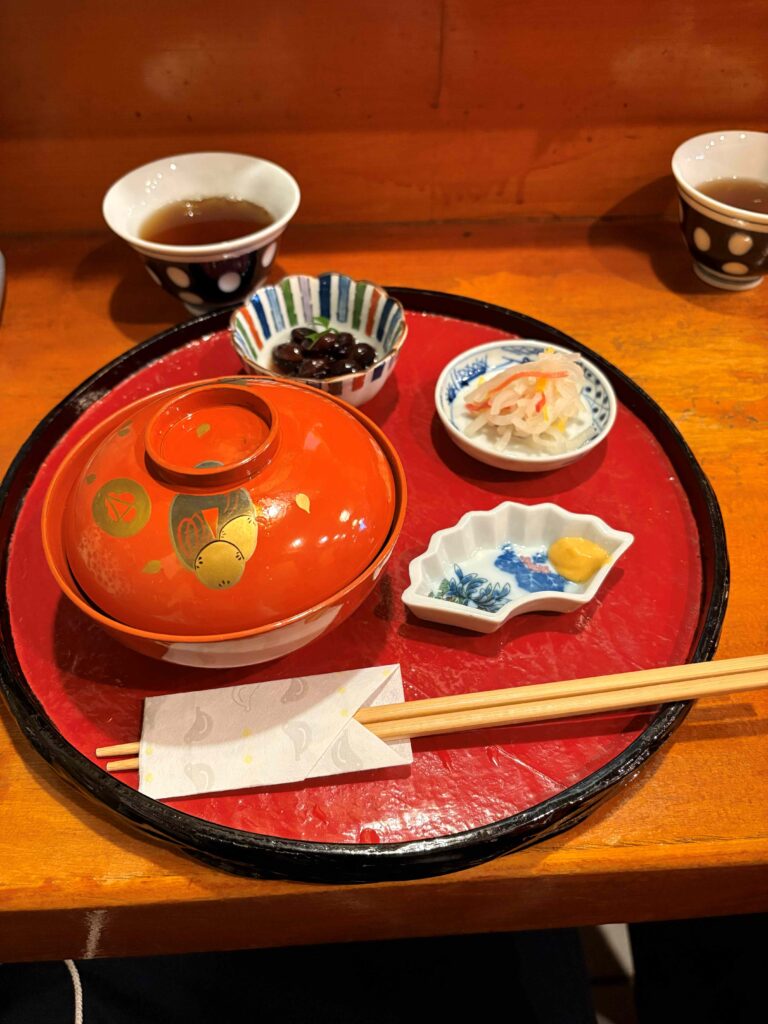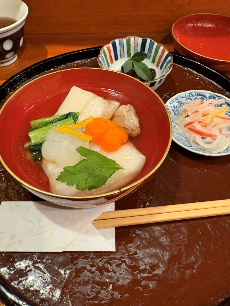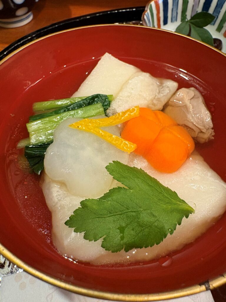 僕は「おすましのお雑煮」を。真っ赤なお椀で届くお雑煮、蓋を開けるとふわっと良いお出汁の匂いが広がります。