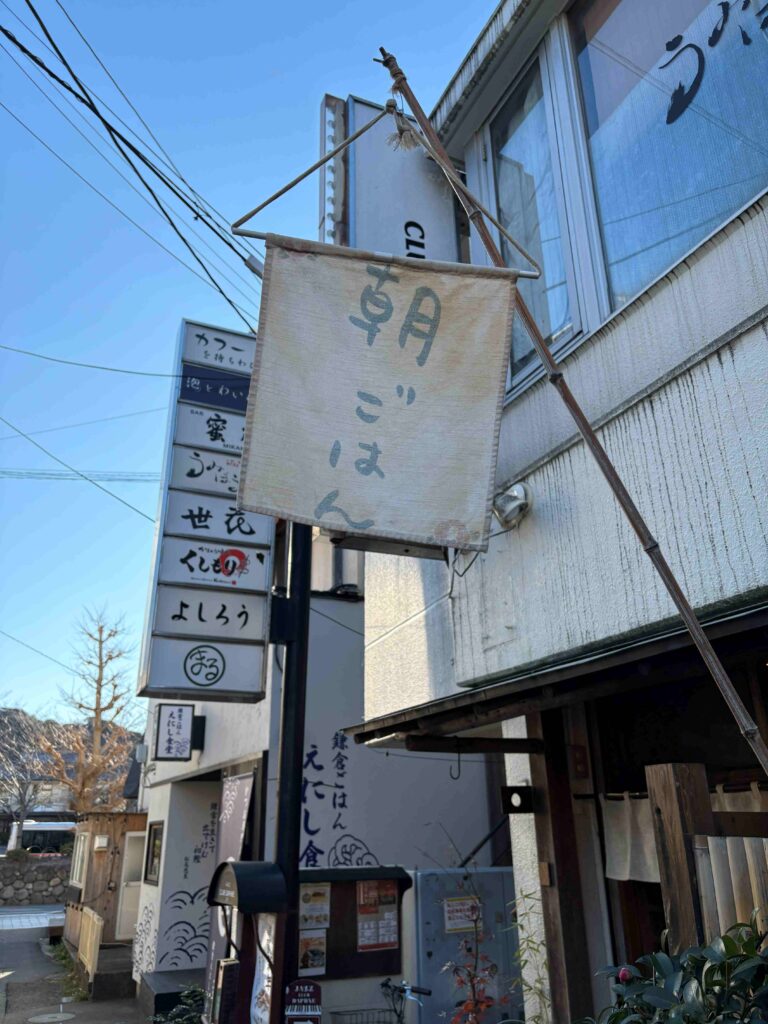 1/3、時間は8:30、若宮大路を鶴岡八幡宮方向に歩いて、二の鳥居のちょっと先を小道に入った所にあるのが「朝ごはん」さん。