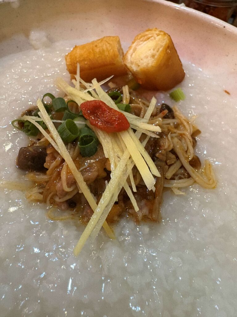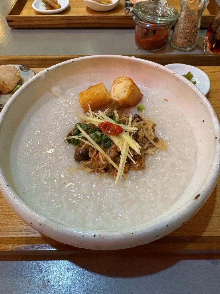 今日はお外のテーブル席にご案内頂いて、僕は「肉きのこ粥」を単品で。