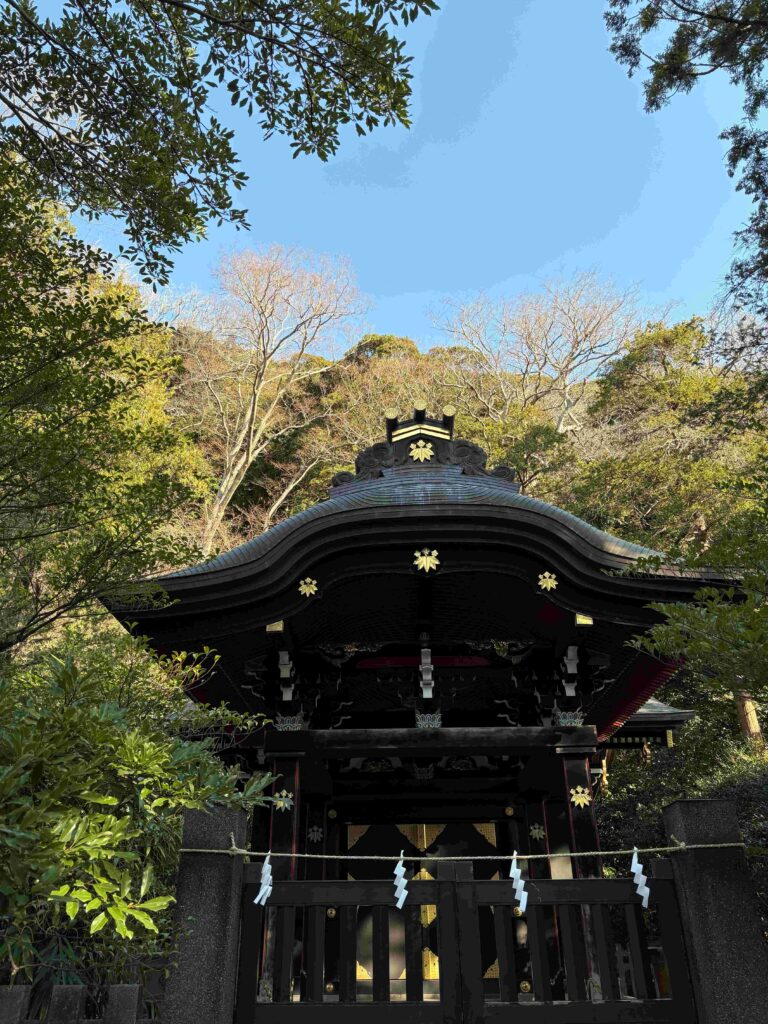 さらに人も少なくなって、木々に包まれ、厳かな空気。本宮や舞殿と比べ、漆黒の本殿です。
