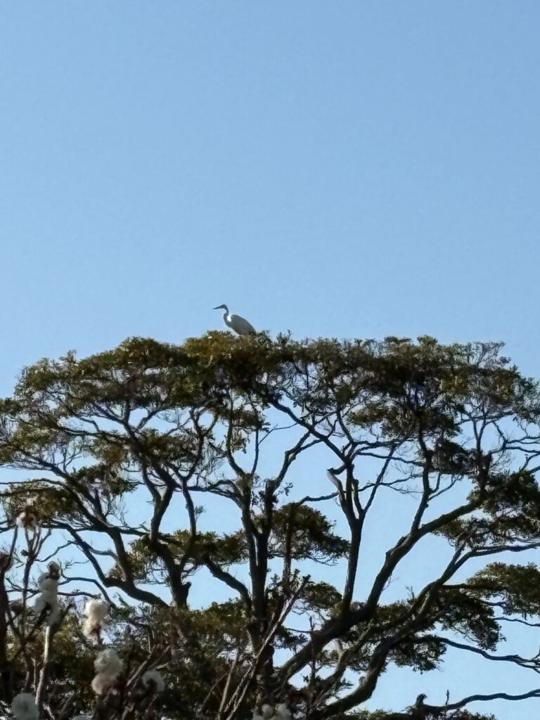 そこから下がると源平池ですが、その池の木々の上に白い鷺が。