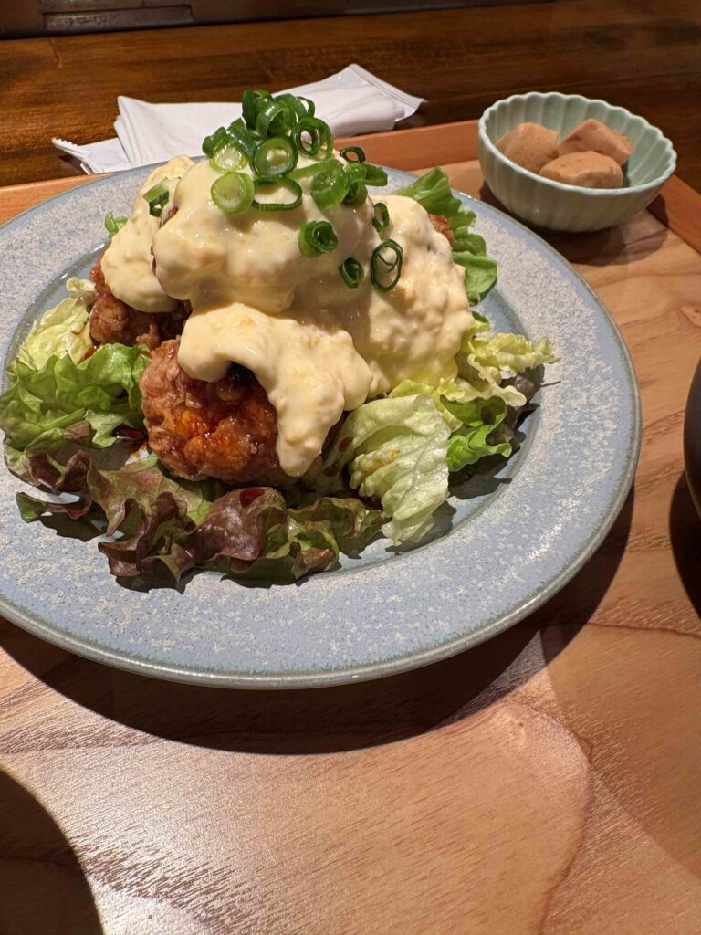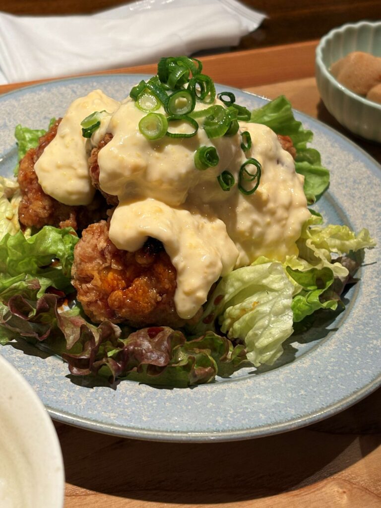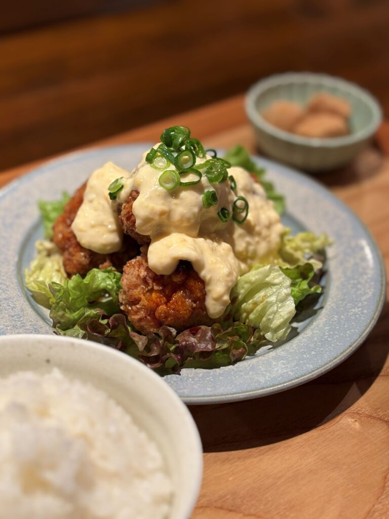 山盛りになったさっくさくのチキンにたっぷりかかった自家製のタルタル、甘辛くてご飯が進む〜