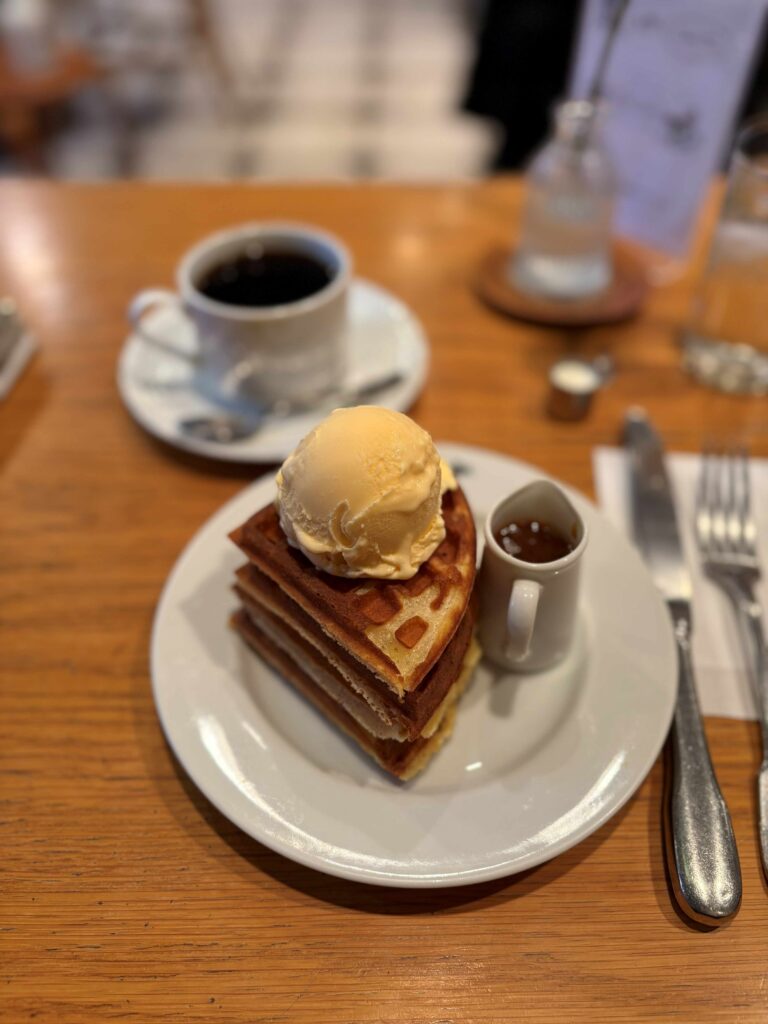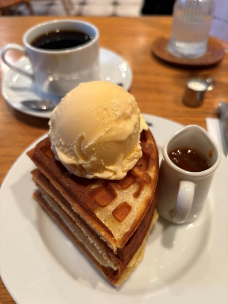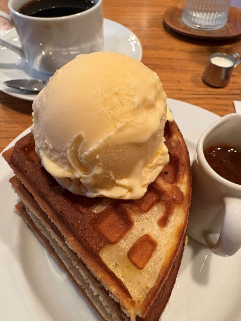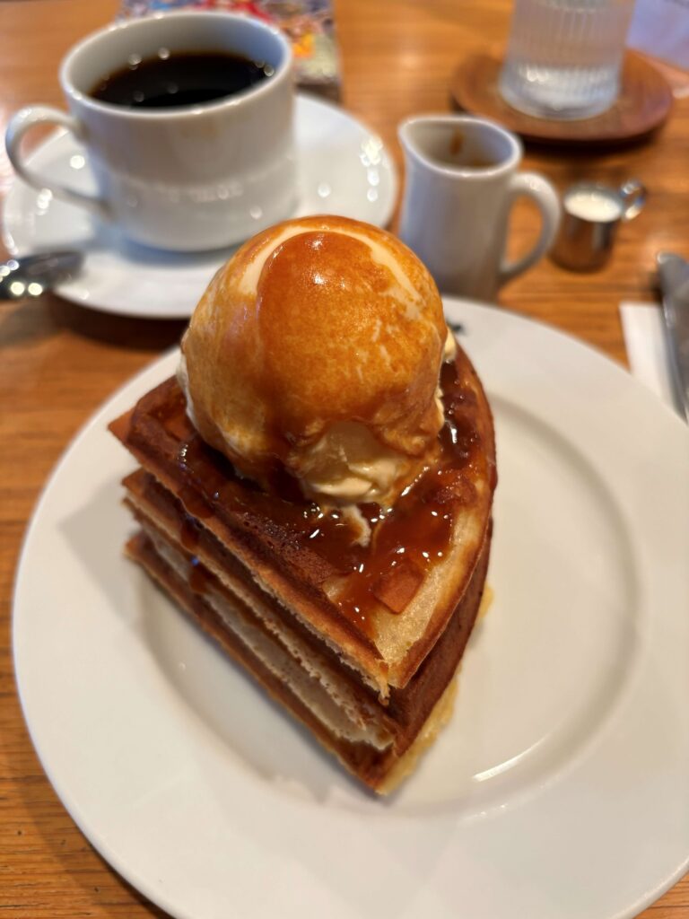 なので、一人だけど見た目も楽しいさくさくワッフルの四段重ね、そこにアイスとキャラメルソースをたらーりかけて頂く「セーベーエスウー」を。
