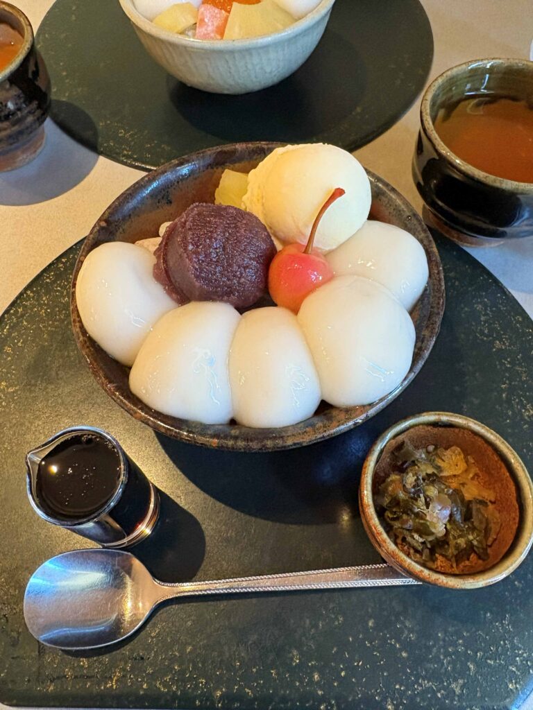 とろける滑らかなあんこに爽やかなアイスクリームが乗って、そこに優しい甘さの黒蜜をとろーりとかけていただきました。