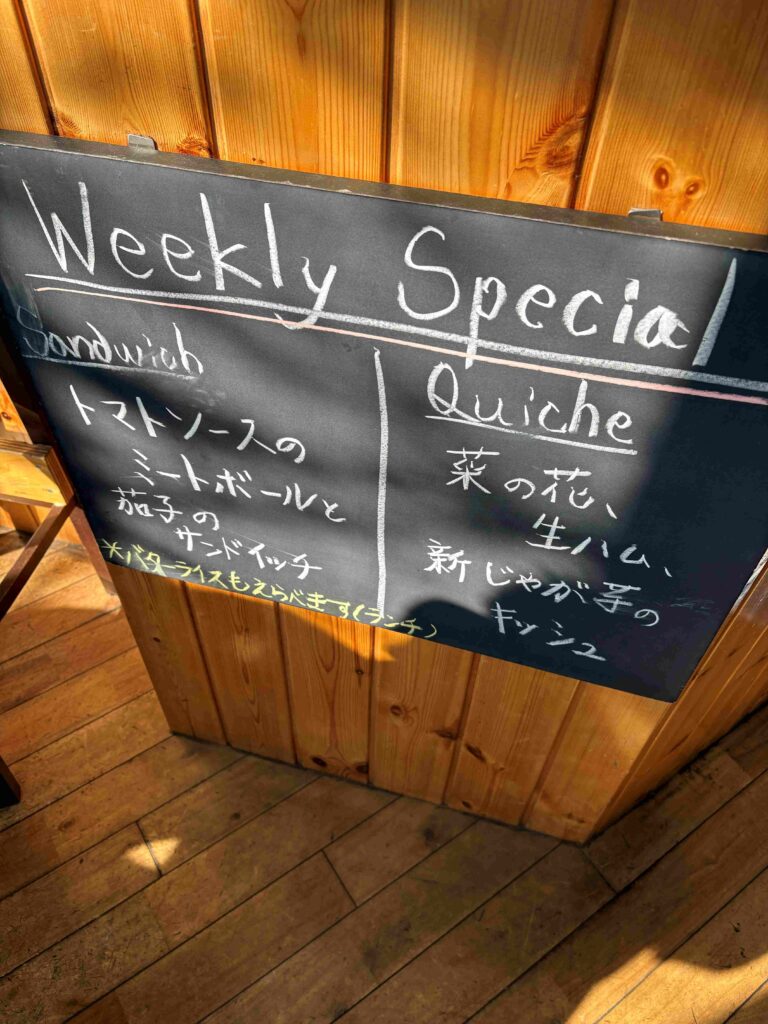 お店に入ってすぐにある黒板には、週替わりのサンドイッチとキッシュのメニューが書かれていますが、いつも今週はなんだろうと、とてもワクワクします。